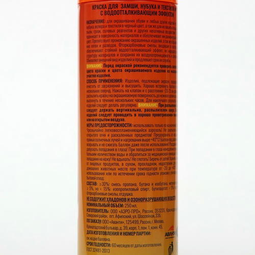 Аэрозоль-краска предназначена для восстановления и усиления яркости цвета, закрашивания потертостей, придания ухоженного вида и повышения водоотталкивающих свойств замши, нубука, велюра.
