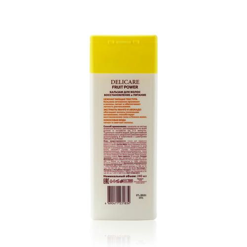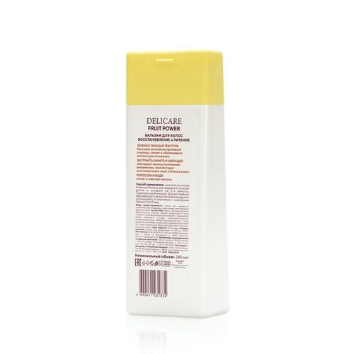 Бальзам для волос Delicare Fruit Power «Восстановление и питание» насыщает волосы активными питательными веществами и способствует восстановлению волос по всей длине. Нежная тающая текстура бальзама мгновенно проникает в волосы, питает и обеспечивает легкость расчесывания. Экстракты манго и авокадо обогащают волосы полезными витаминами, способствуют восстановлению силы и блеска волос. Кокосовая вода питает и смягчает волосы. Бальзам-ополаскиватель мгновенно устраняет ломкость и признаки повреждений, предотвращает появление секущихся кончиков и улучшает структуру волос. Средство обеспечивает эффективный уход за волосами без утяжеления, возвращает волосам гладкость и эластичность.