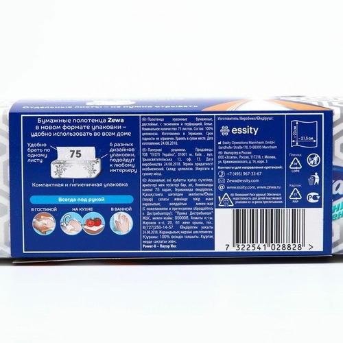 Бумажные полотенца Zewa “Удобная Упаковка” – супер прочные и впитывающие бумажные полотенца, которые можно выжимать. Два плотных слоя из целлюлозы позволят легко удалить любые сухие и влажные загрязнения, ими также удобно вытереть руки, использовать вместо полотенца или тряпки для уборки. Благодаря новому формату сложения, извлечение листов стало проще – их не нужно отрывать. Бумажные полотенца станут незаменимым помощником как на кухне, так и в ванной, гостиной, прихожей, а 6 стильных дизайнов упаковки подойдут к любому интерьеру в доме. Срок годности не ограничен.