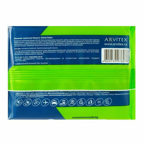 Описание: влажная туалетная бумага Emily Style, растворяющаяся 30шт. Влажную туалетную бумагу Emily Style можно использовать как самостоятельное средство гигиены, так и в дополнении к обычной туалетной бумаге. Она изготовлена из мягкого, нежного материала аэрлейд, не содержит спирта, поддерживает нейтральный Ph. Полностью растворяется в канализации. Экстракт ромашки очищает и защищает кожу от инфекций и вредных бактерий. Экстракт алое повышает бактериостатические свойства кожи.