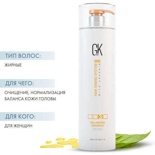 балансирующий кондиционер GK после мытья головы. Для закрепления эффекта увлажнения и защиты оставьте кондиционер на 5-7 минут, затем тщательно смойте теплой водой
