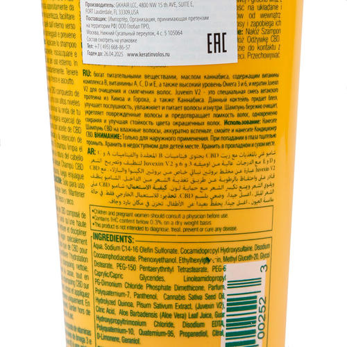 Состав: вода, натрий 14-16 олефин сульфонат, кокамидопропил гидроксисултаин, динатрий кокоамфодиацетат, феноксиэтанол, этилгексилглицерин, метил глюцет-20, гликоль дистеарат, ПЭГ-150 пентаэритритил тетрастеарат, ПЭГ-6 каприлик/каприк глицериды, линолеамидопропил ПГ- димония хлорид фосфат диметикон, ароматизатор, поликватерниум -7, пантенол, масло каннабиса, гидролизованный киноа, экстракт гороха (джувексин В2), лимонная кислота, сок алоэ вера, гуар гидроксипропилтримония хлорид, динатрий эдта, поликватерниум-10, кватерниум-95, пропанедиол, цитраль, д-лимонен, гераниол.