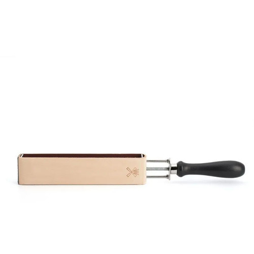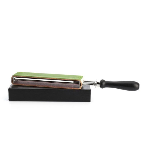 Этот двусторонний натянутый ремень для правки опасной бритвы оснащен ручкой. Кожаная сторона предназначена для заточки с использованием пасты, в то время, как текстильная поверхность используется для легкого хонингования, которое продлевает время между заточками.