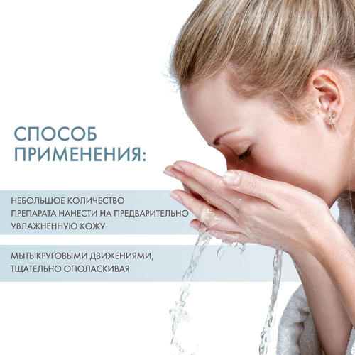 Небольшое количество геля нанесите на увлажненную водой кожу, распределите круговыми движениями. Тщательно смойте теплой водой