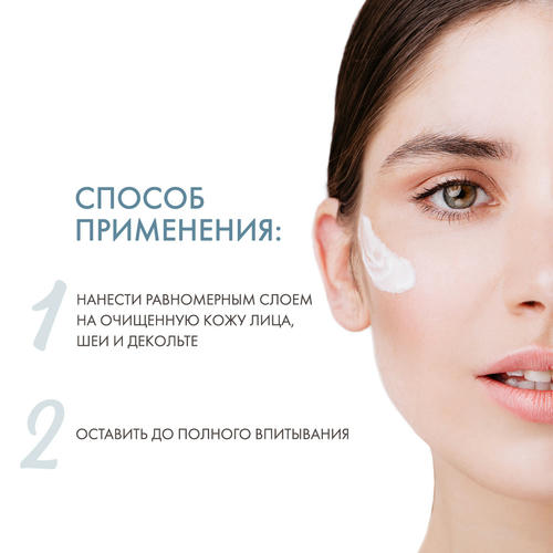 Легкими массажными движениями нанесите крем на очищенную кожу лица, шеи, декольте. Применяйте 1-2 раза в день