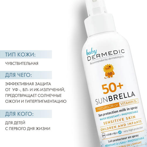 Защитное молочко-спрей для детей обеспечивает высокую, эффективную и длительную защиту от UVA, UVB, VL и ИК-излучения.