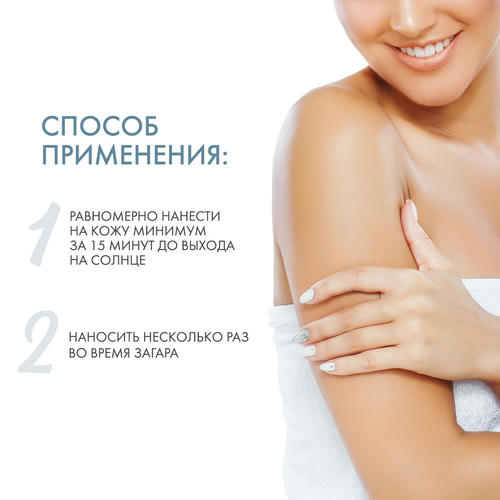 Равномерно нанесите на кожу лица и тела как минимум за 15 минут до выхода на солнце. Применение следует повторять несколько раз в течение дня, также после контакта с водой.