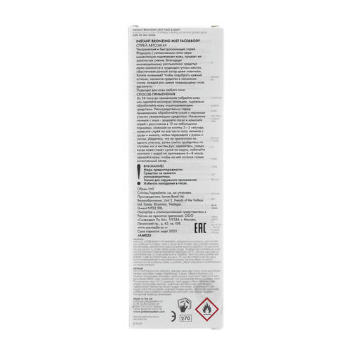 Состав: диметиловый эфир, вода, спирт денат., дигидроксиацетон, пропиленгликоль, эритрулоза, глицерин, peg-40 гидрогенизированное касторовое масло, лимонная кислота, токоферилацетат, сок листьев алоэ barbadensis, сквалан, убихинон, сорбат калия, ci 16035 (красный 40), ci 19140 (желтый 5), ci 42090 (синий 1)