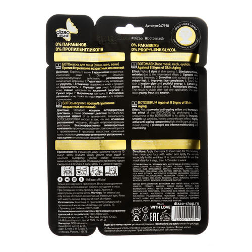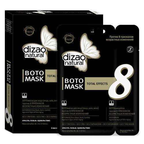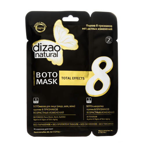Набор уходовой косметики порой занимает много места. При этом эффективность средств оставляет желать лучшего. Хочется, чтобы одна маска решала сразу все проблемы и поддерживала красоту и молодость кожи без дополнительных процедур. Именно так действует двухэтапная ботомаска для лица, шеи и век «БОТО 8 признаков» с антивозрастной сывороткой.