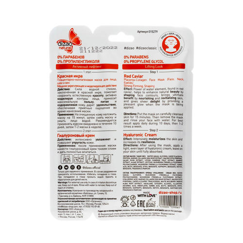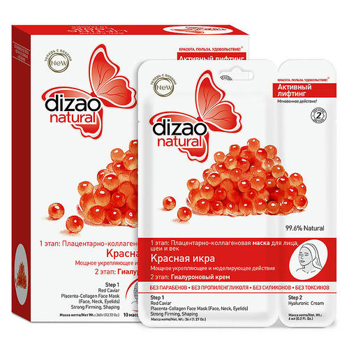 1 этап: Плацентарно-коллагеновая маска для лица и шеи. Мощное укрепляющее и моделирующее действие Как действует маска? моделирует овал лица разглаживает морщины увлажняет насыщает кожу витаминами и минералами блокирует действие свободных радикалов В результате применения маски: кожа выглядит подтянутой и помолодевшей. 2 этап: гиалуроновый крем Действие гиалуронового крема: интенсивно увлажняют и повышают упругость кожи. Рекомендация по применению: после применения маски нанести гиалуроновый крем тонким слоем и дать полностью впитаться. Преимущества масок для лица Dizao: 99,6% натуральных ингредиентов Содержит растительный коллаген и растительную гиалуроновую кислоту СПА-эффект: восстановление, моделирование лица Экспресс-лифтинг Не содержит парабенов, ГМО, продуктов нефтехимии Экологичная удобная упаковка