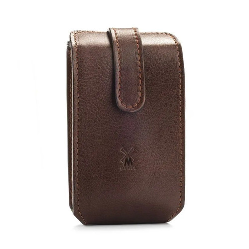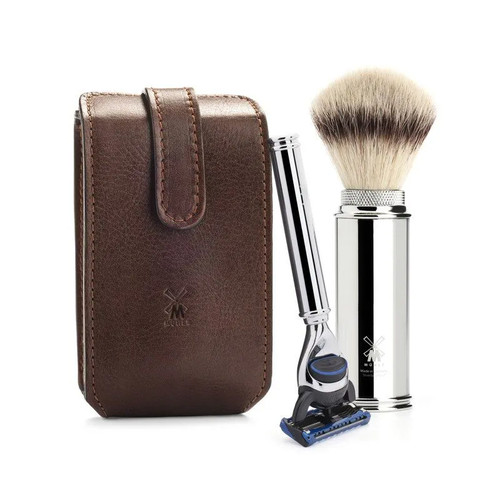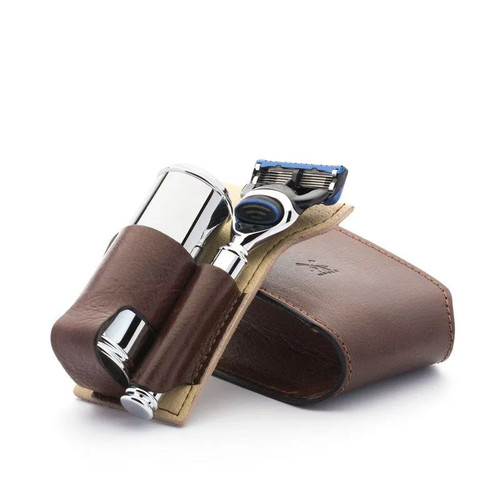 Более компактные и легкие по весу дорожные наборы для бритья ничуть не менее функциональны, чем стандартные наборы MUHLE. Помазок помещается в тубус с помощью удобного поворотного механизма и закрывается колпачком из хромированного металла, что отлично защищает его в дороге. Кисть помазка в дорожных наборах делается только из фибры Silvertip – самой быстросохнущей и очень износостойкой. Чехол ручной работы из черной или коричневой кожи, исполненный во флорентийском стиле, плотно вмещает бритву и помазок.