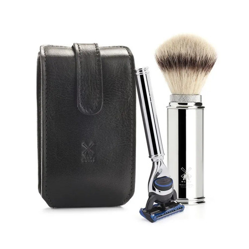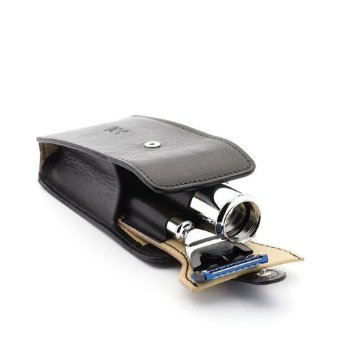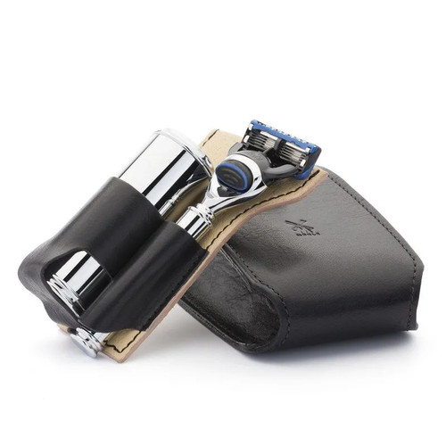 Более компактные и легкие по весу дорожные наборы для бритья ничуть не менее функциональны, чем стандартные наборы MUHLE. Помазок помещается в тубус с помощью удобного поворотного механизма и закрывается колпачком из хромированного металла, что отлично защищает его в дороге. Кисть помазка в дорожных наборах делается только из фибры Silvertip – самой быстросохнущей и очень износостойкой. Чехол ручной работы из черной или коричневой кожи, исполненный во флорентийском стиле, плотно вмещает бритву и помазок.