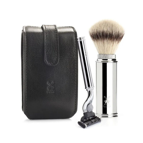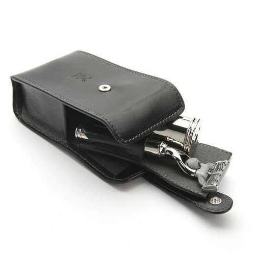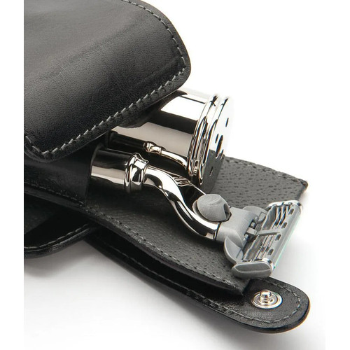 Более компактные и легкие по весу дорожные наборы для бритья ничуть не менее функциональны, чем стандартные наборы MUHLE. Помазок помещается в тубус с помощью удобного поворотного механизма и закрывается колпачком из хромированного металла, что отлично защищает его в дороге. Кисть помазка в дорожных наборах делается только из фибры Silvertip – самой быстросохнущей и очень износостойкой. Чехол ручной работы из черной или коричневой кожи, исполненный во флорентийском стиле, плотно вмещает бритву и помазок.