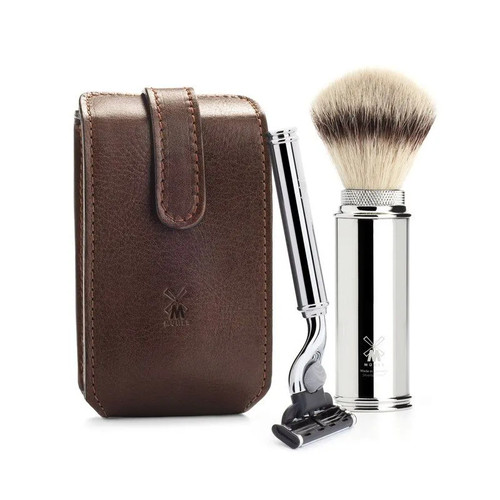 Более компактные и легкие по весу дорожные наборы для бритья ничуть не менее функциональны, чем стандартные наборы MUHLE. Помазок помещается в тубус с помощью удобного поворотного механизма и закрывается колпачком из хромированного металла, что отлично защищает его в дороге. Кисть помазка в дорожных наборах делается только из фибры Silvertip – самой быстросохнущей и очень износостойкой. Чехол ручной работы из черной или коричневой кожи, исполненный во флорентийском стиле, плотно вмещает бритву и помазок.