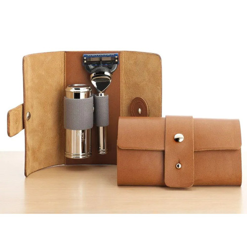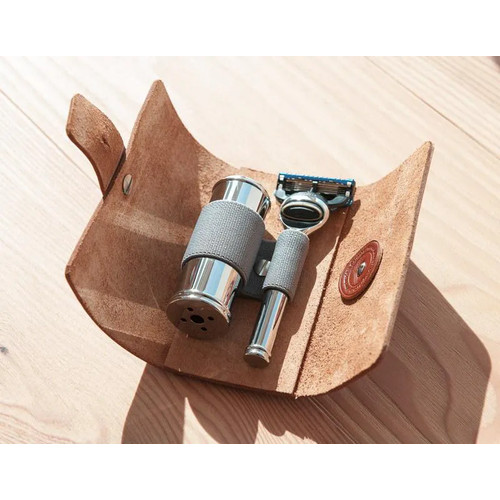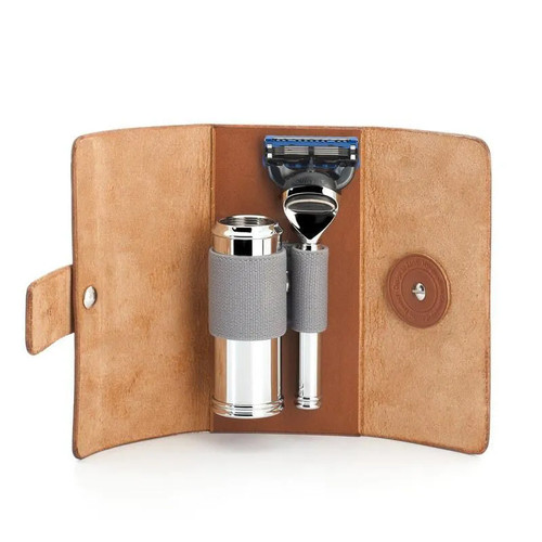 Привычке использовать элегантные и качественные принадлежности для бритья совсем не обязательно изменять, даже когда Вы отправляетесь в путешествие. Чехол для дорожного набора MUEHLE, вмещающий бритву и складной дорожный помазок, произведен из натуральной телячьей кожи, обработанной методом растительного дубления. Такая кожа имеет вид необработанной и будет носиться очень долго, приобретая по мере использования благородную патину, отражающую индивидуальность и характер своего владельца, историю его путешествий. Помазок помещается в тубус с помощью удобного поворотного механизма и закрывается колпачком из хромированного металла, что отлично защищает его в дороге. Кисть помазка в дорожных наборах делается только из фибры Silvertip – самой быстросохнущей и очень износостойкой.