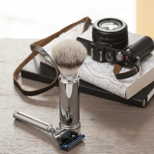Дорожный помазок для бритья в тубусе, с ворсом из фибры высшей категории Silvertip. Помазок помещается в тубус с помощью удобного поворотного механизма и закрывается колпачком из хромированного металла, что отлично защищает его в дороге. Кисть помазка в дорожных наборах делается только из фибры Silvertip – самой быстросохнущей и очень износостойкой.