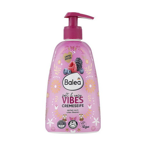 Жидкое крем-мыло Balea Soft & Cosy Vibes тщательно и бережно очищает кожу, увлажняет, питает и делает ее мягкой – каждый день! С нежным составом, увлажняющими веществами для сбалансированного ухода за вашей кожей. Нежный аромат лесных ягод мгновенно поднимают настроение. Подарите себе момент релаксации и ухода с жидким крем-мылом для рук Balea Soft & Cosy Vibes. Рецепт без микропластика и водорастворимых, чисто синтетических полимеров.