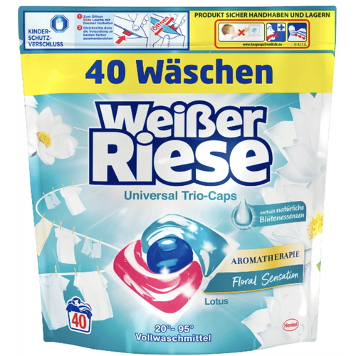 Гелевые капсулы для стирки универсального белья Weisser Riese Universal Trio-Caps AromaTherapie Lotos & Mondelol – это эффективное и удобное средство для стирки, которое обеспечивает максимальную чистоту и свежесть вашего белого и цветного белья. Они содержат специальную формулу, разработанную для защиты цвета и предотвращения выцветания тканей.