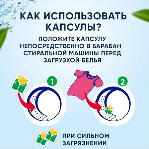 Способ применения: Положите капсулу непосредственно в барабан стиральной машины перед загрузкой белья. При средних загрязнениях 1 капсула = 1 стирка. При сильных загрязнениях и жесткой воде 2 капсулы = 1 стирка. Не замачивать! Не рекомендуется использовать для режимов стирки длительностью менее 40 минут