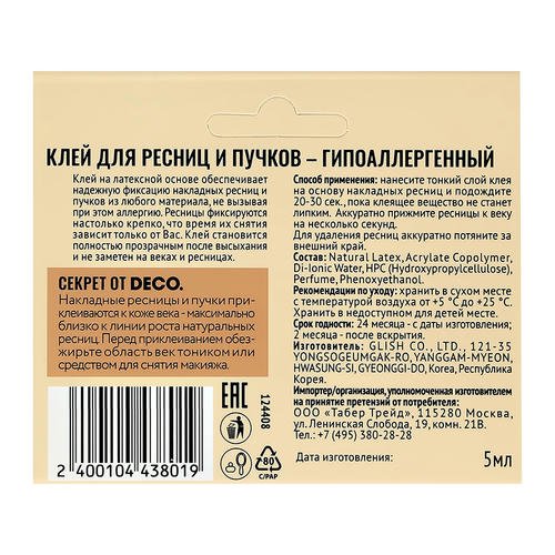 Клей на латексной основе обеспечивает надежную фиксацию накладных ресниц и пучков из любого материала, не вызывая при этом аллергию. Ресницы фиксируются настолько крепко, что время их снятия зависит только от Вас. Клей становится полностью прозрачным после высыхания и не заметен на веках и ресницах.Секрет от DE.CO:Накладные ресницы и пучки приклеиваются к коже века – максимально близко к линии роста натуральных ресниц. Перед приклеиванием обезжирьте область век тоником или средством для снятия макияжа.