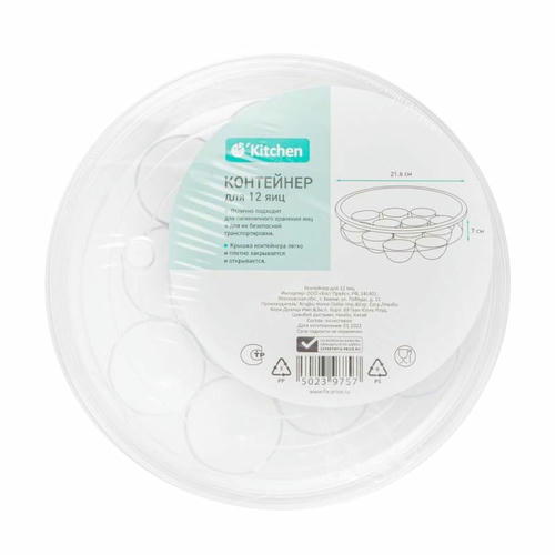 Контейнер для 12 яиц, O`Kitchen, подходит для гигиеничного хранения яиц и для их безопасной транспортировки. Крышка контейнера легко и плотно закрывается и открывается. Размер: 21,6х7 см. Состав: полистирол
