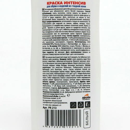 Полимерныи_ флакон с губкои_-аппликатором. Интенсивныи_ белыи_ цвет. Предназначен для подкраски и защиты изделии_ из гладкои_ натуральнои_ и искусственнои_ кожи, за исключением замши, нубука, велюра. – подходит для спортивнои_ обуви и кроссовок. Обладает водоотталкивающими свои_ствами. – не допускает замораживания.