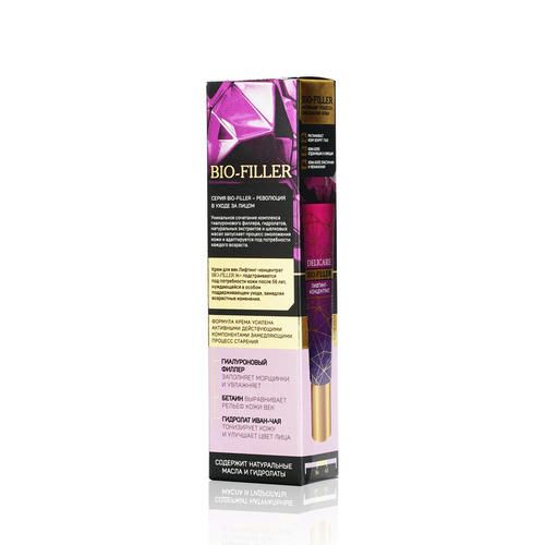 Серия BIO-FILLER – революция в уходе за лицом. Уникальное сочетание комплекса гиалуронового филлера, гидролатов, натуральных экстрактов и шелковых масел запускает процесс омоложения кожи и адаптируется под потребности каждого возраста. Крем для век Лифтинг-концентрат BIO-FILLER 56+ подстраивается под потребности кожи после 56 лет, нуждающейся в особом поддерживающем уходе, замедляя возрастные изменения. Формула крема усилена активными действующими компонентами замедляющими процесс старения. Гиалуроновый филлер заполняет морщинки и увлажняет, бетаин выравнивает рельеф кожи век, гидролат иван-чая тонизирует кожу и улучшает цвет лица. Ежедневное применение способствует уменьшению возрастных проявлений, разглаживает кожу и уменьшает проявление морщинок.
