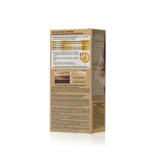 Only Bio – наука и природа в основе идеального окрашивания. Стойкая крем-краска для волос Only Bio – это настоящее открытие в колористике родом из Франции. Впервые краситель представлен в масляной форме, интенсивно насыщен пигментами и обеспечивает превосходное стойкое и бережное окрашивание. Формула без аммиака разработана в научно-косметической лаборатории Silab France с заботой о Ваших волосах: 9 масел в основе краски защищают волосы в процессе окрашивания, предотвращают ломкость и способствуют глубокому проникновению пигмента в структуру волоса. Omega-кислоты камелии обеспечивают длительное увлажнение волос и дарят многогранные переливы цвета. 90% от активных компонентов в составе краски составляют масла. Результат: идеальное закрашивание седины и попадание в цвет, как при салонном окрашивании.