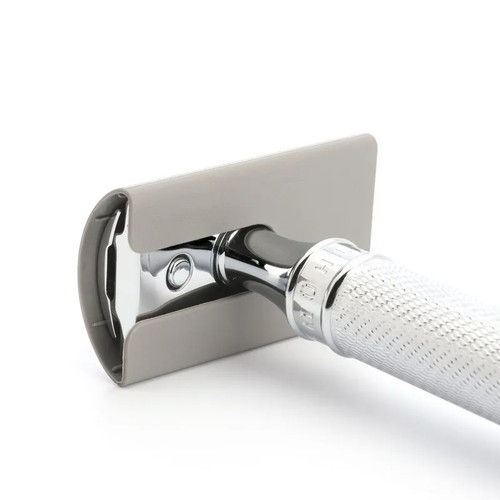Защитная пластиковая крышка для Т-образной бритвы закрывает лезвие, защищая от порезов во время хранения или перевозки станка.