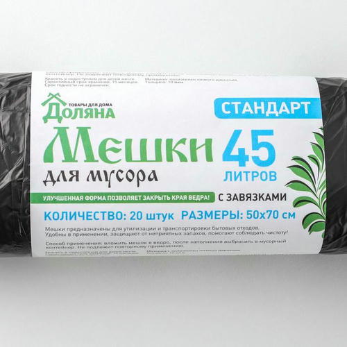 Мешки для мусора с завязками Доляна «Стандарт», 45 л, 50×70 см, 10 мкм, ПНД, 20 шт, цвет чёрный