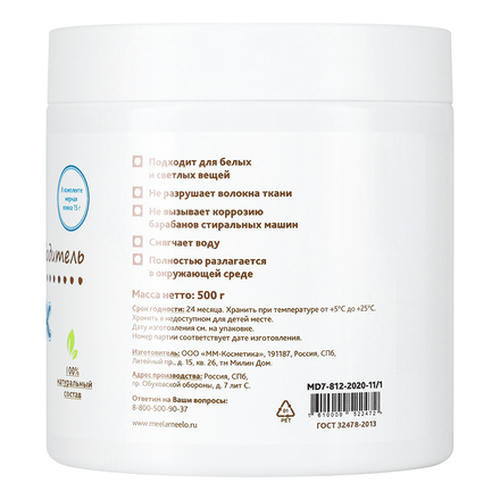 Продукт легко и эффективно удаляет пятна от вина, крови, кофе, трав, фруктов и овощей, жира и грязи с белья и одежды. Оно бережно относится к окрашенным тканям, подходит как для белых, так и для цветных вещей. Средство смягчает воду, устраняет неприятные запахи, полностью разлагается в окружающей среде, не разрушает волокна ткани, не вызывает коррозию барабанов стиральных машин, не требует кипячения, эффективно при температуре от +50 °С.