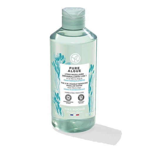 Мицеллярная Вода Для Снятия Макияжа 2 в 1 очищает кожу от загрязнений и удаляет даже стойкий макияж, оставляя кожу идеально очищенной, увлажненной и сияющей. В состав входят Микроводоросли Tetraselmis, выращенные согласно принципам агроэкологии у берегов Бретани, во Франции, и обладающие способностью насыщать кожу кислородом*.