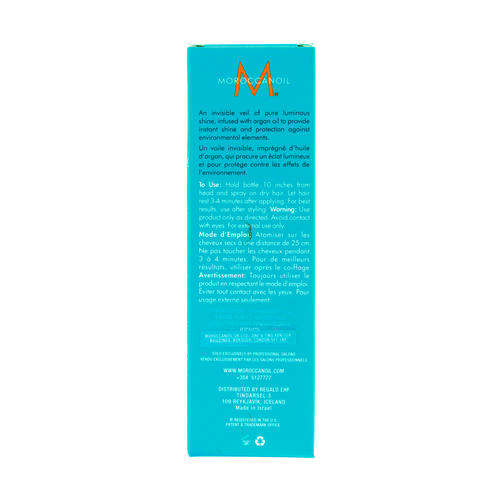 Спрей-блеск для волос Moroccanoil – идеальное завершение любой укладки. Его инновационная формула притягивает и отражает свет, покрывая волосы невидимой вуалью чистого, сияющего блеска. Насыщенное маслом арганы, витаминами и антиоксидантами, это средство помогает защитить волосы от вредного воздействия УФ-излучения и влияний окружающей среды – солнечных лучей, соленой воды и хлора. Мерцающий блеск подчеркивает цвет волос, колорирование и мелирование, обеспечивая красивое сияние в любых условиях освещения.