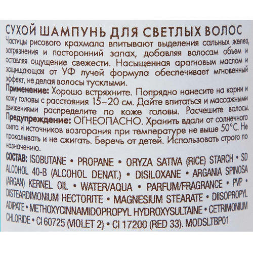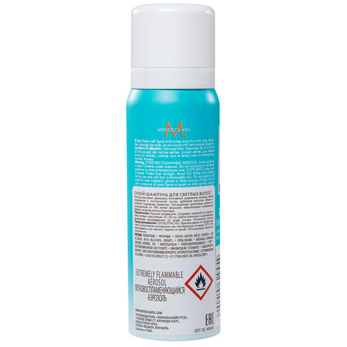 Moroccanoil разработала сухой шампунь в двух вариантах: для светлых волос и для темных волос. Сухой шампунь Moroccanoil для светлых волос содержит мелкий порошок из рисового крахмала, который впитывает жиры, убирает наслоения и неприятный запах, освежает и очищает волосы. Формула фиолетового оттенка с высоким содержанием арганового масла защищает от негативного воздействия ультрафиолетового излучения, помогает восстановить цветовой баланс светлых волос и сохраняет однородность их окраски.