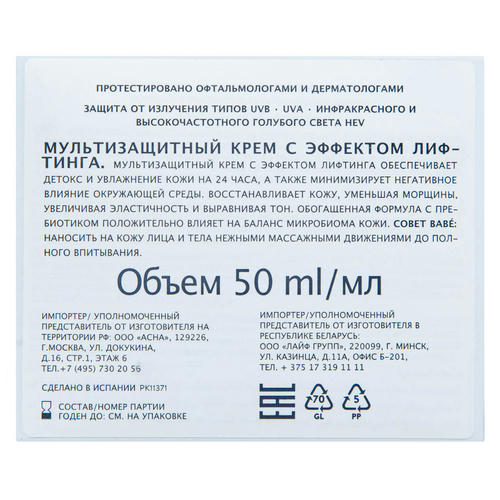 Мультизащитный крем с эффектом лифтинга SPF 30 увлажняет кожу, уменьшая морщины, повышая эластичность и выравнивая тон кожи. Обеспечивает увлажнение на 24 часа. Формула разработана для защиты от солнечного света и ежедневного загрязнения, обогащена пребиотическим активным ингредиентом, который способствует балансу микробиома кожи. Кремовая текстура средства хорошо увлажняет кожу и придает ей ощущение приятной бархатистости. Идеальный крем для начала дня.