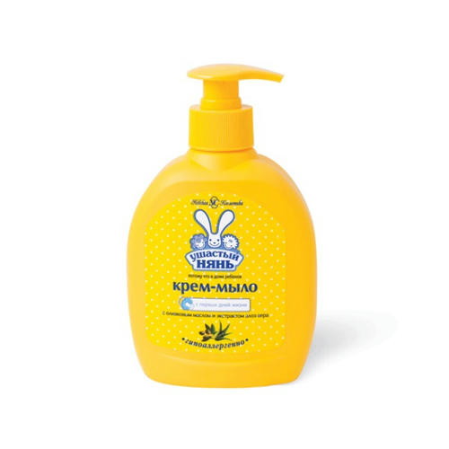 Жидкое крем-мыло УШАСТЫЙ НЯНЬ 300мл. Упаковка: флакон с дозатором. Крем-мыло содержит ценное оливковое масло и экстракт алоэ вера (сок алоэ). Без красителей, щелочи. Подходит для мытья тела. ГОСТ 31696-2012