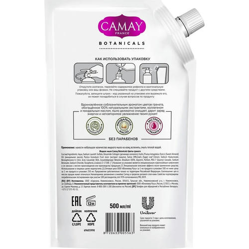 Состав: Aqua, Sodium Laureth Sulfate, Desamido Collagen (дезамидо коллаген), Inulin, Prunus Amygdalus Dulcis (Sweet Almond) Oil (миндальное масло), Punica Granatum Fruit Juice (экстракт граната), Salvia Officinalis (Sage) Leaf Extract, Sodium Hyaluronate, Benzophenone-4, Citric Acid, Cocamide DEA, Cocamidopropyl Betaine, Disodium EDTA, Glycerin, Parfum, PEG-7 Glyceryl Cocoate, Sodium Benzoate, Sodium Chloride, Tocopherol, Linalool, CI 17200