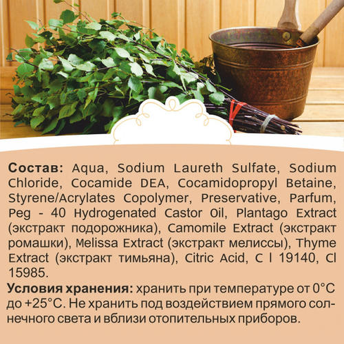 Состав: Aqua, Sodium Laureth Sulfate, Sodium Chloride, Cocamide DEA, Cocamidopropyl Betaine, Styrene/Acrylates Copolymer, Preservative, Parfum, Peg-40 Hydrogenated Castor Oil, Plantago Extract (экстракт подорожника), Camomile Extract (экстракт ромашки), Melissa Extract (экстракт мелиссы), Thyme Extract (экстракт тимьяна), Citric Acid, CI 19140, CI 15985