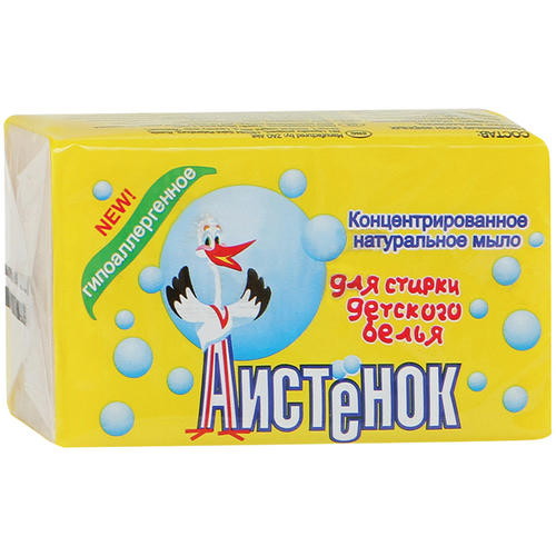 Мыло хозяйственное твёрдое «Аистёнок » для стирки детского белья, серии «Зелёные технологии» , представляет собой продукт, состоящий из натриевых солей жирных кислот натуральных жиров и масел (кокосового, пальмового, подсолнечного). В состав мыла входят также глицерин, полиглюкозид, антиоксидант. Концентрированное гипоаллергенное натуральное мыло «Аистёнок» изготовлено из высококачественного сырья со специальными добавками для удаления специфических детских загрязнений. Обладает высокой моющей способностью, мягкой пеной и бережным воздействием на кожу рук. Хорошо выполаскивается. Обеспечивает мягкость одежде, а ребёнку –ощущение комфорта. Цветосберегающие добавки сохраняют яркость ткани. Не содержит отдушку. Не вызывает аллергических реакцийГОСТ 30266. Соответствует требованиям технического регламента Таможенного союза «Технический регламент на масложировую продукцию» (ТР ТС 024/2011)срок годности 36