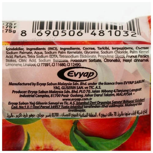 Состав: Sodium Palmate, Aqua, Sodium Palm Kernelate, Glycerine, Sodium Chloride, Palm Kernel Acid, Parfum, Tetra Sodium EDTA, Tetrasodium Etidronate, Propylene Glycol, Prunus Persica Stokes, Citrit Acid, Sodium Benzoate, Potassium Sorbate, Citronellol, Hexyl Cinnamal, Limonene, Linalool, Сl 77891, Сl 11680, Сl 12490