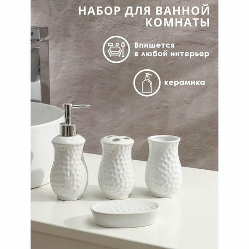 Набор аксессуаров для ванной комнаты Доляна «Рельеф», 4 предмета (дозатор 340 мл, мыльница, два стакана 300 мл) , цвет белый