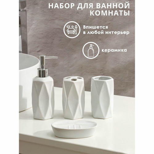 Набор аксессуаров для ванной комнаты Доляна «Геометрия», 4 предмета (дозатор, мыльница, два стакана), цвет белый