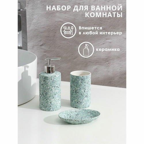 Набор аксессуаров для ванной комнаты Доляна «Гранит», 3 предмета (дозатор 350 мл, мыльница, стакан), цвет зелёный