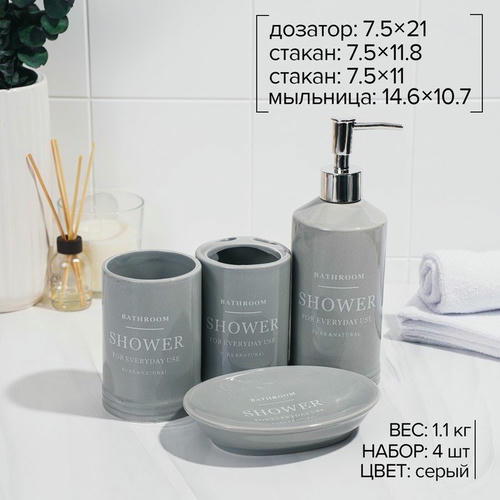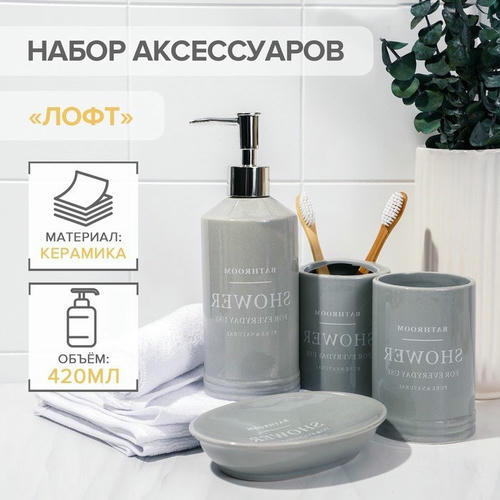 Набор аксессуаров для ванной комнаты «Лофт», 4 предмета (мыльница, дозатор для мыла 400 мл, 2 стакана 320 мл), цвет серый