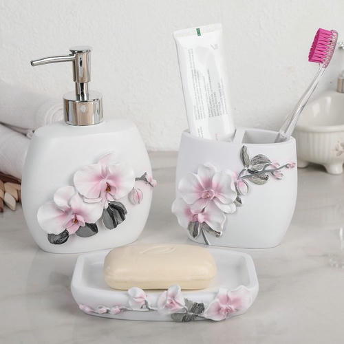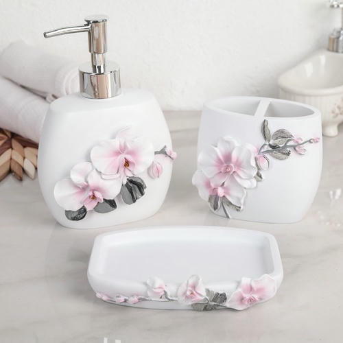 Набор предметов для ванной «Орхидея» не только внесёт изюминку в интерьер, но и значительно облегчит хранение некоторых принадлежностей. Изделия устойчивы к резким перепадам температуры и высокой влажности. Также стоит отметить качество аксессуаров — набор при правильном уходе прослужит вам очень долго.