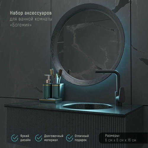 Набор аксессуаров для ванной комнаты Доляна «Богемия», 3 предмета (мыльница, дозатор, стакан), цвет тёмно-зелёный
