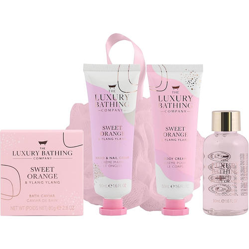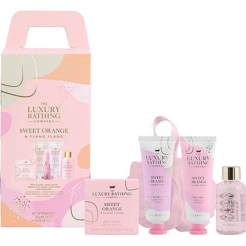 Состав набора: Гель для душа – Grace Cole The Luxury Bathing Sweet Orange & Ylang Ylang Body Wash, 50 мл + Крем для тела – Grace Cole The Luxury Bathing Sweet Orange & Ylang Ylang Body Cream, 50 мл + Крем для рук и ногтей – Grace Cole The Luxury Bathing Sweet Orange & Ylang Ylang Hand & Nail Cream, 50 мл + Жемчужины для ванны – Grace Cole The Luxury Bathing Sweet Orange & Ylang Ylang Bath Caviar, 80 г + Мочалка для тела – Grace Cole The Luxury Bathing, 1 шт
