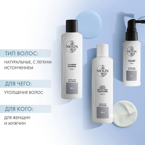 Усиление структуры волос и защита от выпадения при помощи 3-ступенчатой системы Nioxin System 1 для натуральных, с тенденцией к истончению волос. Система включает в себя три продукта по уходу за волосами, в основе которых лежит передовой подход к уходу за кожей. Продукты специально разработаны для укрепления волос и придания им визуальной густоты. 3-ступенчатая система для объема Nioxin System 1 предотвращает выпадение волос, укрепляет их, а также восстанавливает кожу головы, придавая натуральным, слегка редеющим волосам здоровый блеск. Очищающий шампунь Nioxin (150 мл): очищает волосы и кожу головы. Увлажняющий кондиционер Nioxin (150 мл): легкий кондиционер восстанавливает упругость волос, помогает контролировать баланс увлажнения кожи головы и волос. Питательная маска Nioxin (40 мл): восстанавливает кожу головы и увеличивает объем волос.