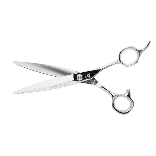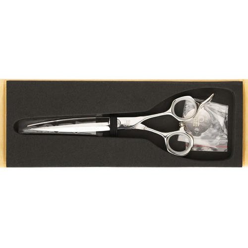 Эргономичный дизайн. ПРИНЦИПИАЛЬНО НОВАЯ МОДЕЛЬ ДВОЙНОГО НАЗНАЧЕНИЯ. Кончики ножниц заточены таким образом, чтобы было удобно делать прямой срез не выталкивая волос, а вот далее режущая кромка выполнена так, что можно легко работать в технике скользящего среза. Полотна: сочетание форм меча и бамбукового листа. Скульптурные кольца шестиугольной формы, одно из которых имеет специальный изгиб для лучшей эргономики. Удобный несъемный упор для мизинца.