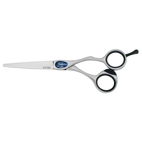 Новый дизайн в стиле 3D. Форма ручек «FX-PRO» такая же, как на моделях серии «FX», но дополнена изогнутым кольцом для большого пальца. Это обеспечивает свободное движение большого пальца и кисти, что очень удобно для мастера. Кроме того, форма одного полотна – «Лезвие меча», а другое – плоское (к голове клиента). Высококачественная нержавеющая сталь (сплав Supreme), винтовая система с сухим подшипником. Ножницы предназначены для всех видов стрижек.